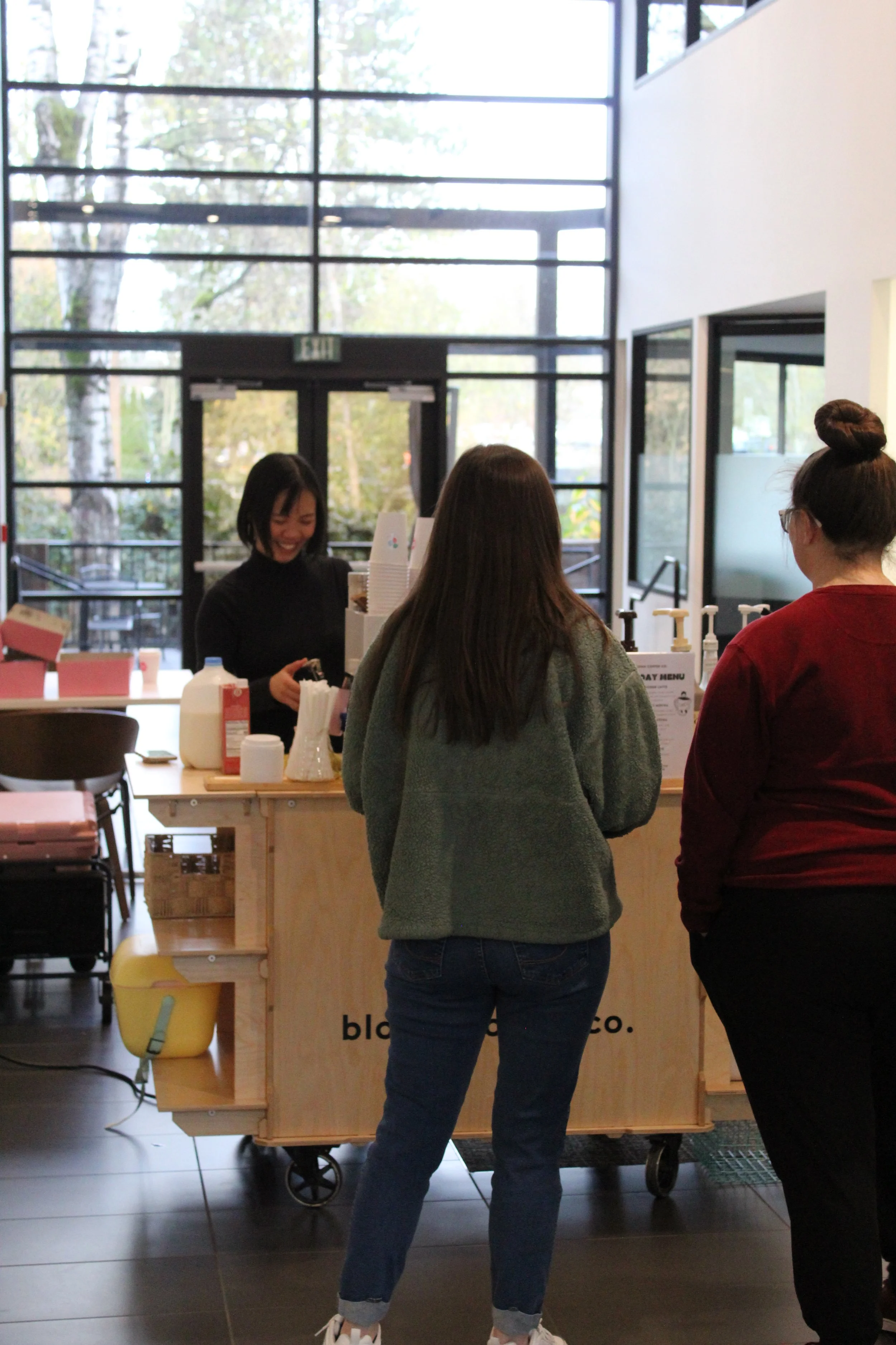Parking Bloom Cart inside the Foster School of Business at University of Washington and celebrating the Staff Members Annual Party. Featured our famous beloved Blooming Rose Latte along with other classic coffee menu items such as espresso, Americano, Cappucinno, Latte, Mocha, and Matcha over over 65 attendees in 2 hours.